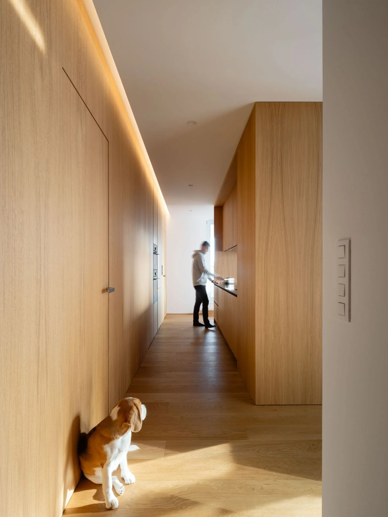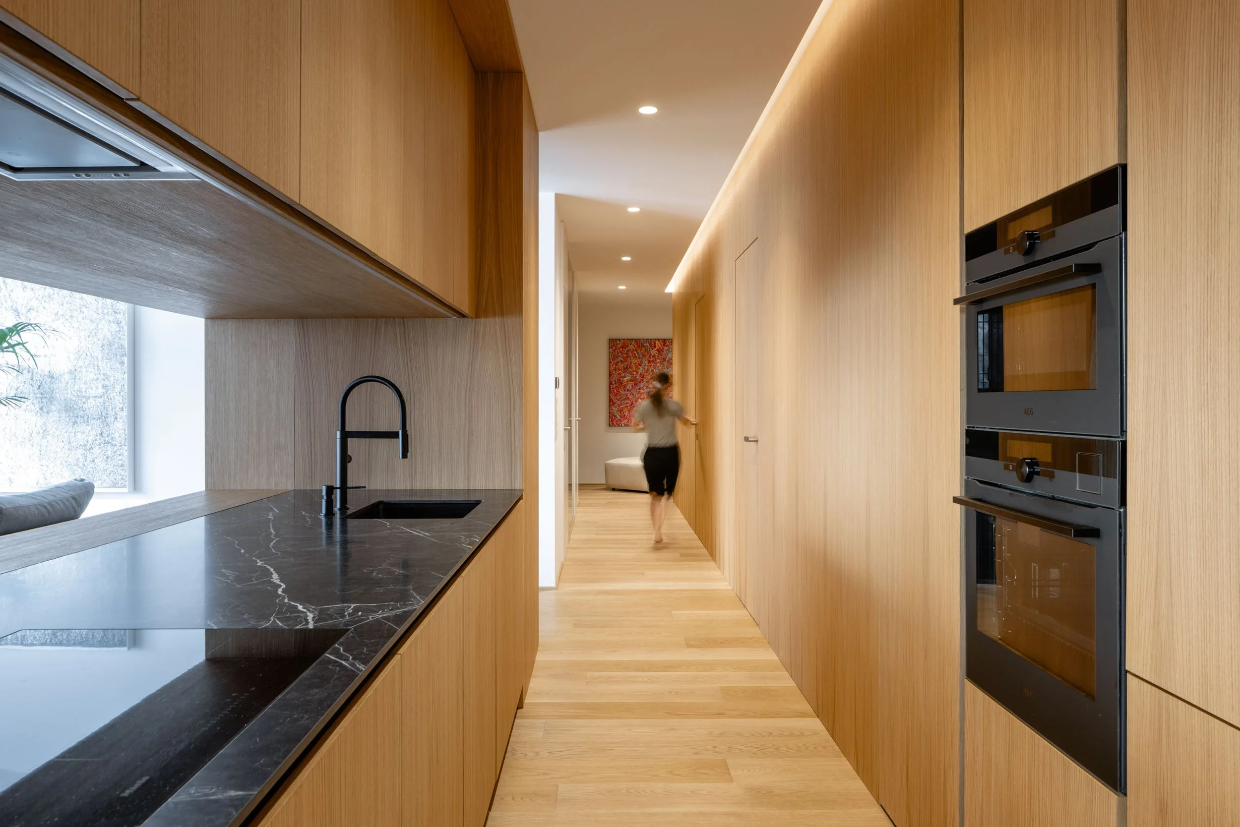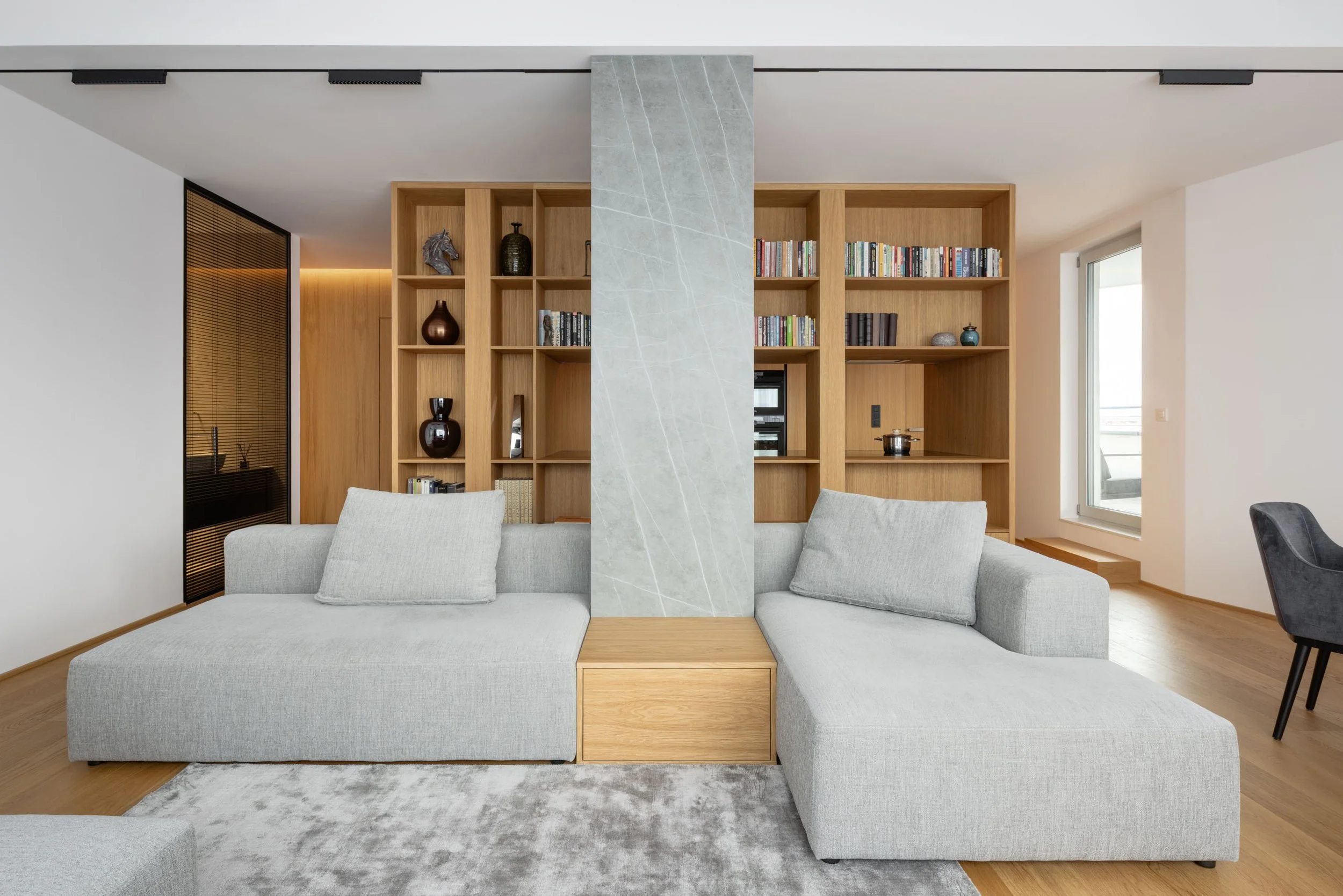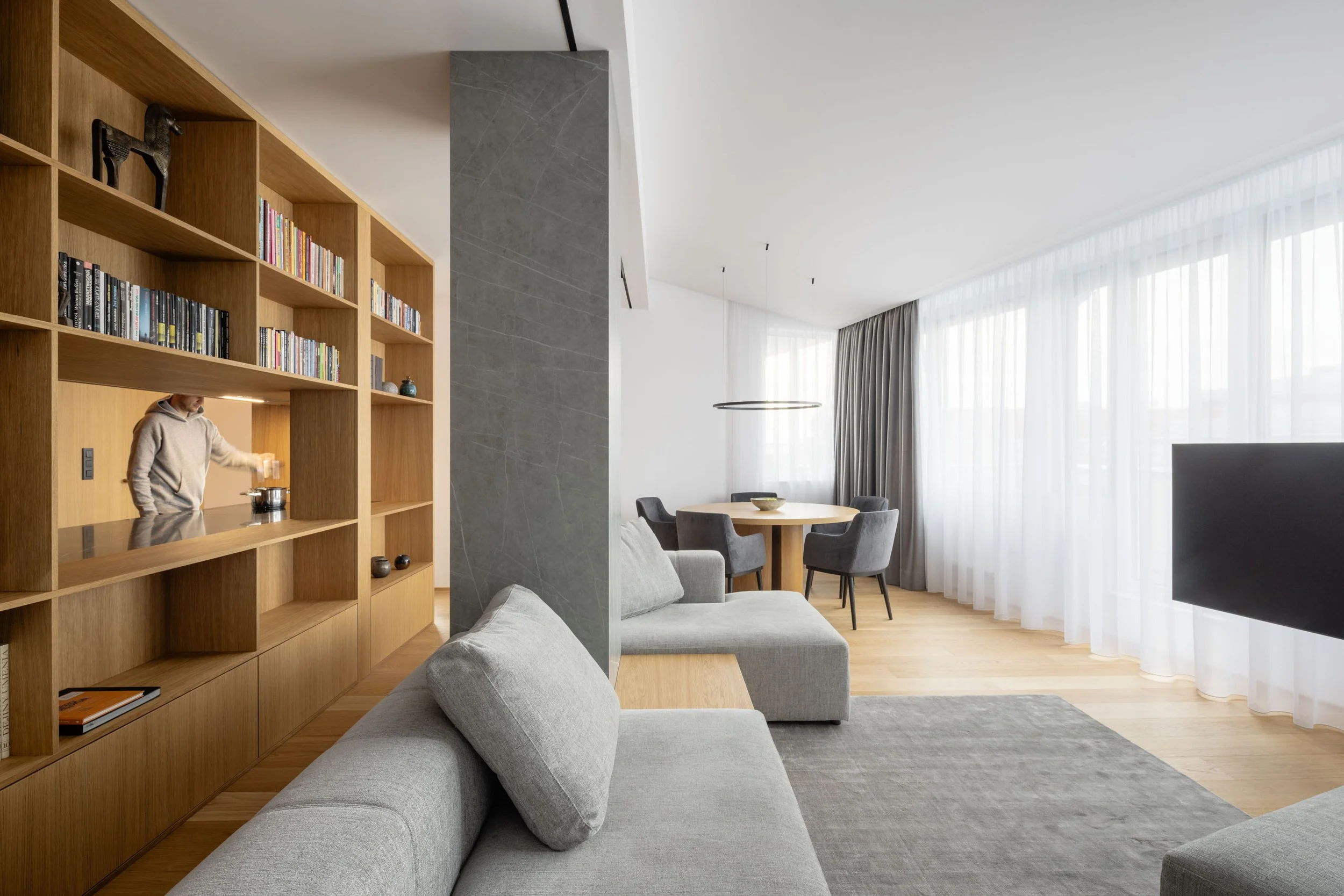 Dominantným prvkom interiéru sa stal kuchynský ostrov, ktorý je spojený s knižnicou a vytvára optický predel medzi kuchynskou a obývacou časťou. Použitie dreveného obkladu so skrytými dverami a podsvietením vizuálne sceľuje dlhú stenu a pomáha dosiahnuť čistý a uhladený vzhľad celého bytu.