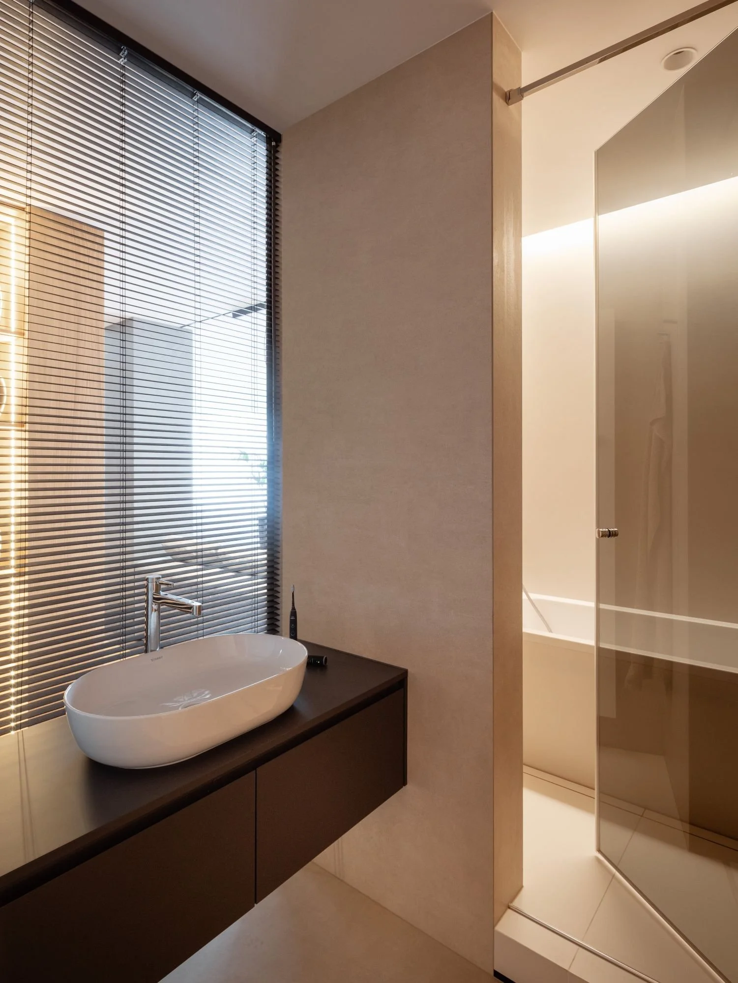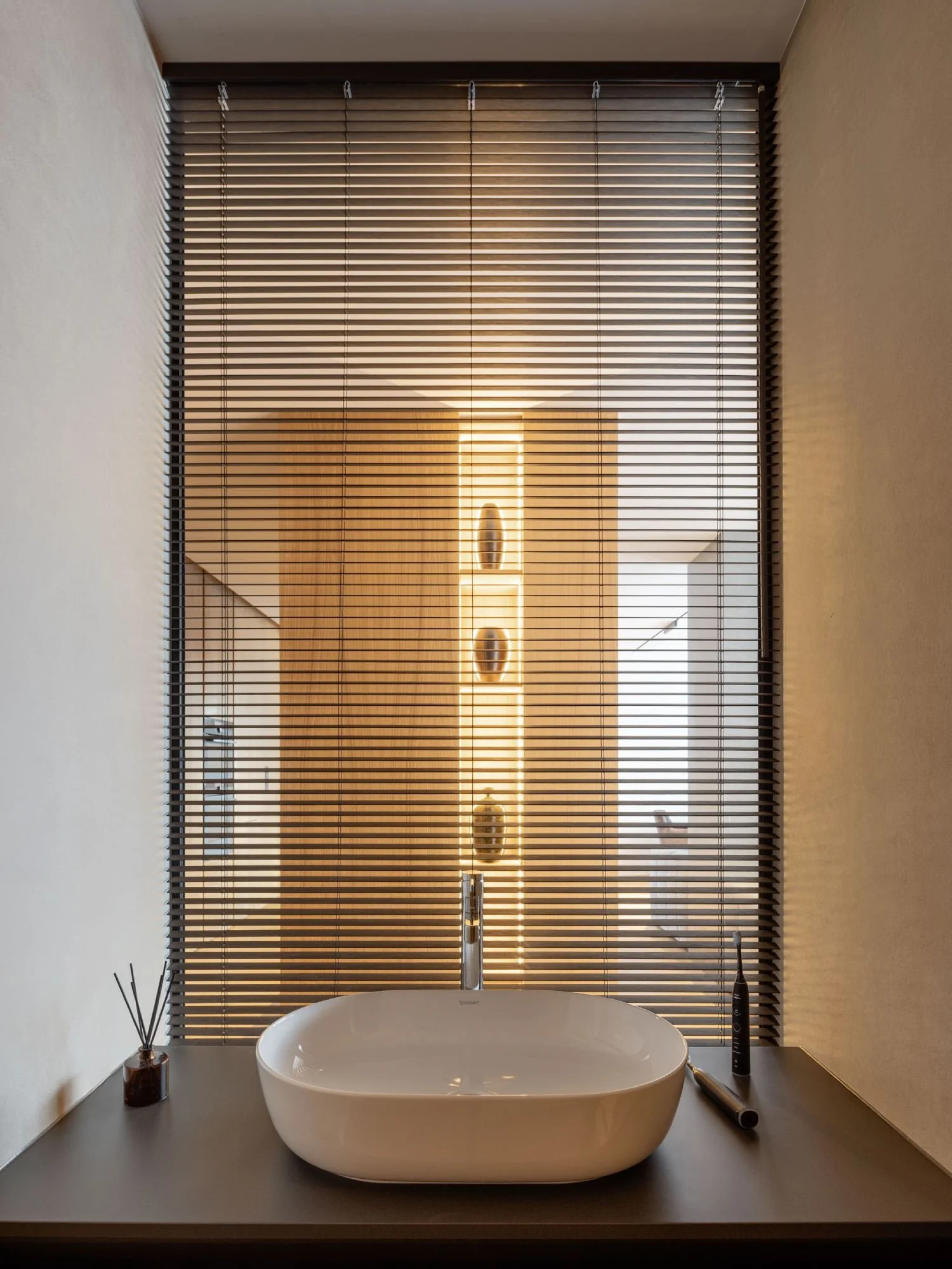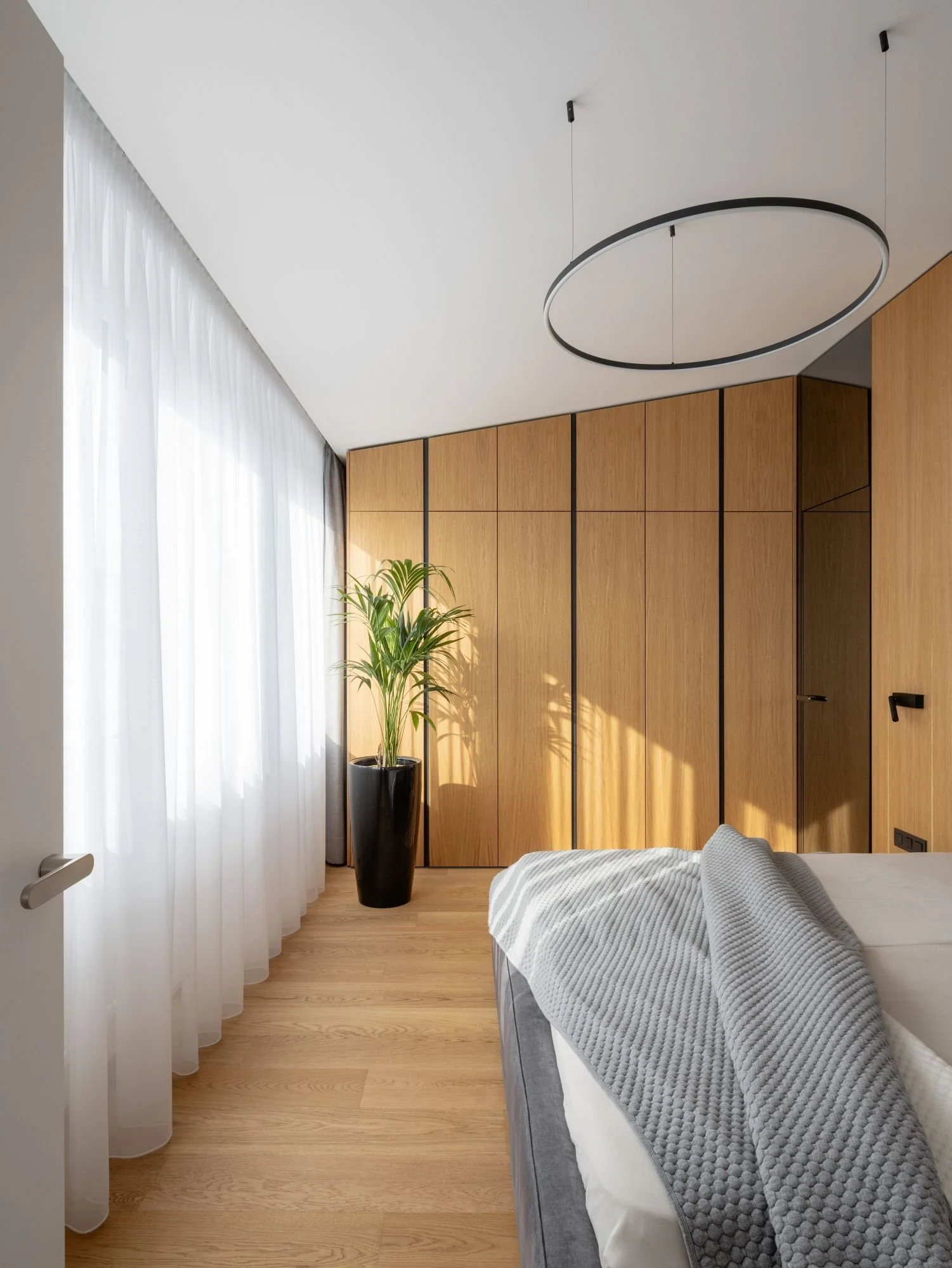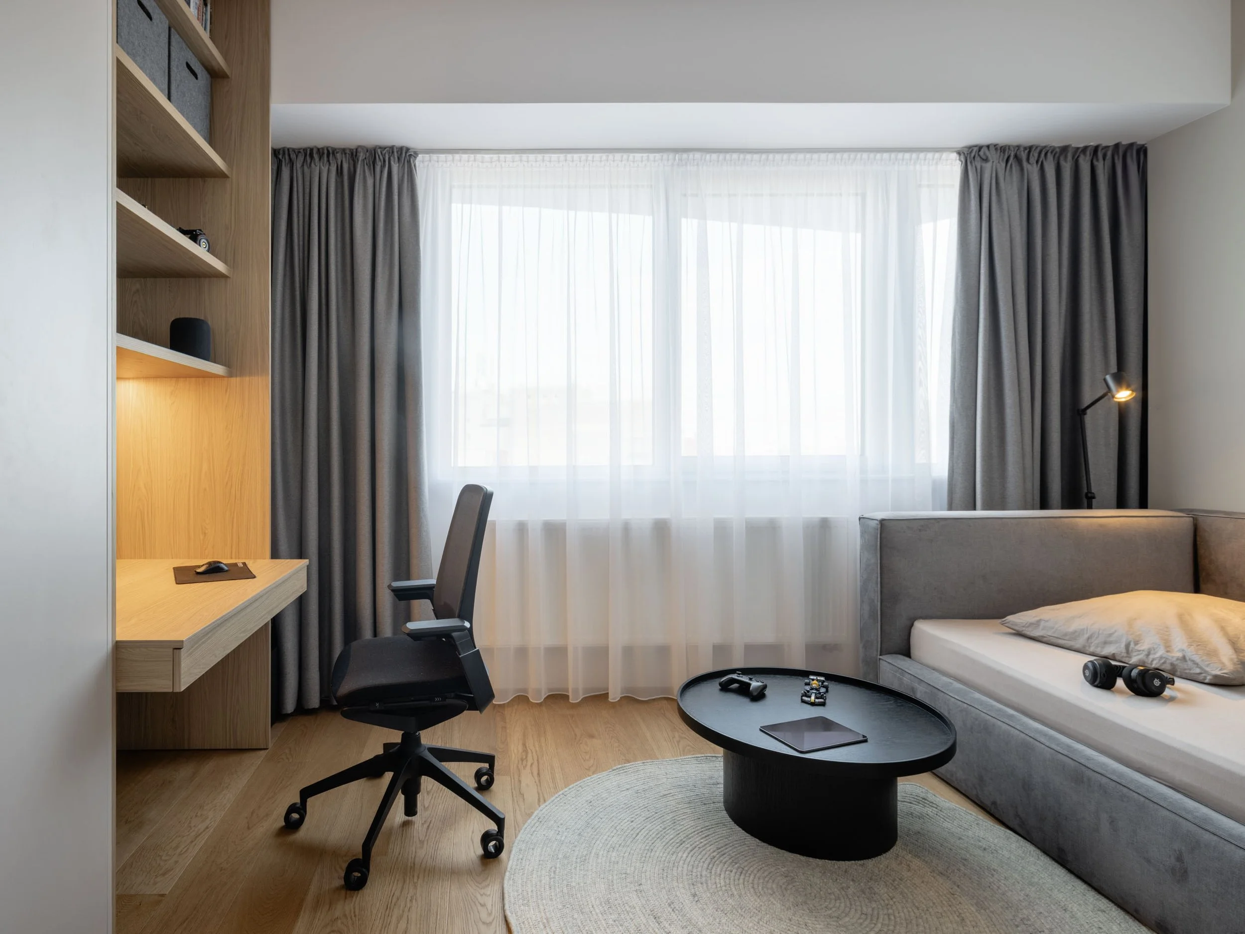 Dominantným prvkom interiéru sa stal kuchynský ostrov, ktorý je spojený s knižnicou a vytvára optický predel medzi kuchynskou a obývacou časťou. Použitie dreveného obkladu so skrytými dverami a podsvietením vizuálne sceľuje dlhú stenu a pomáha dosiahnuť čistý a uhladený vzhľad celého bytu.